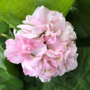 Dubbla blommor melerade i rosa och vitt. Brokbladig, silver bicolour.