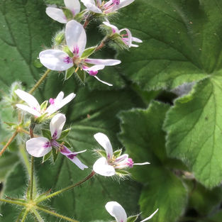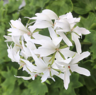 En vild art av Doftpelargon som blommar med sirliga, vita blommor. Små, 3-flikiga, krusiga blad. Vitbrokig och en doft av citron.